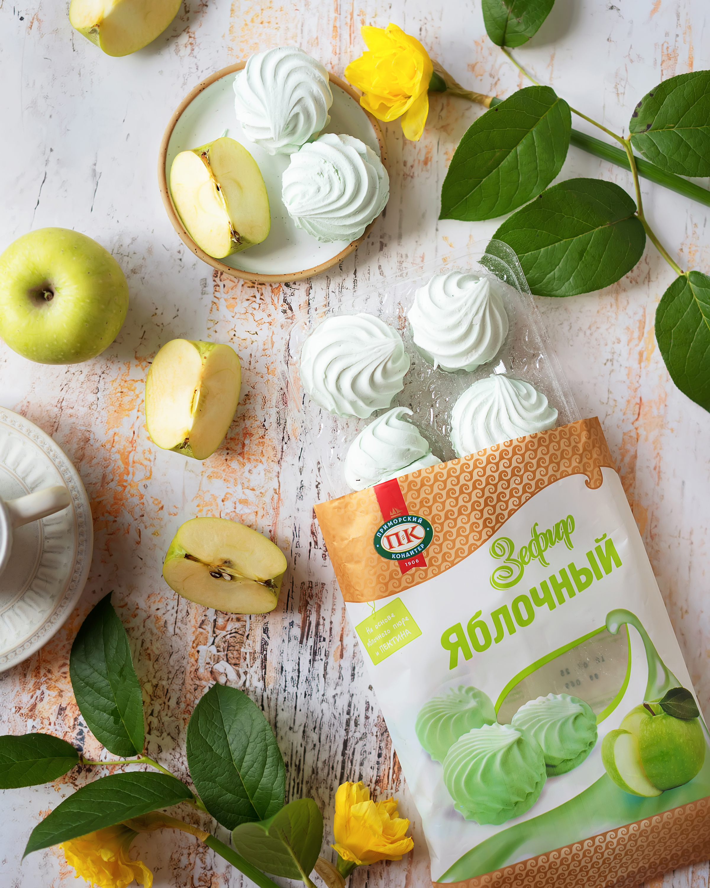 Зефир шарообразной формы рифленой поверхностью. Поверхность обсыпана сахарной пудрой. В составе натуральное. Яблочное пюре и пектин – источник растворимой клетчатки