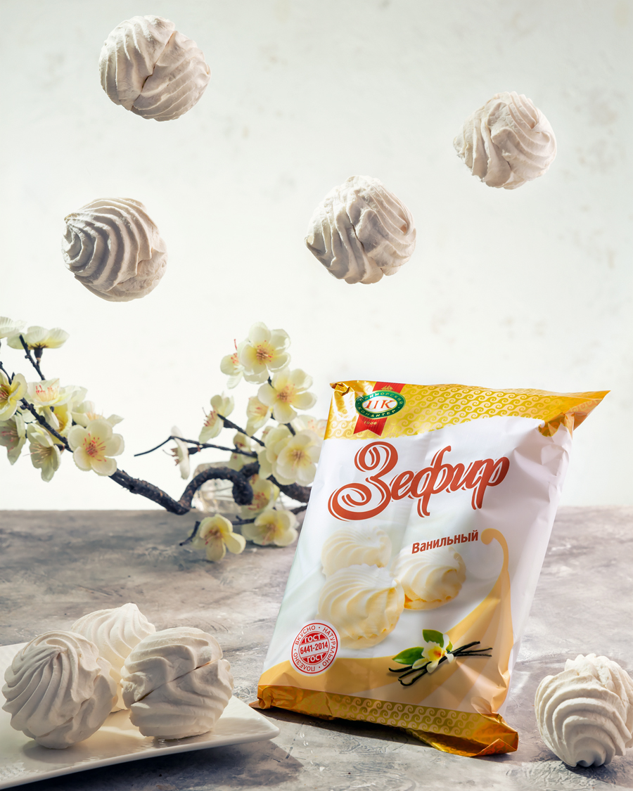 Зефир шарообразной формы рифленой поверхностью. Поверхность обсыпана сахарной пудрой